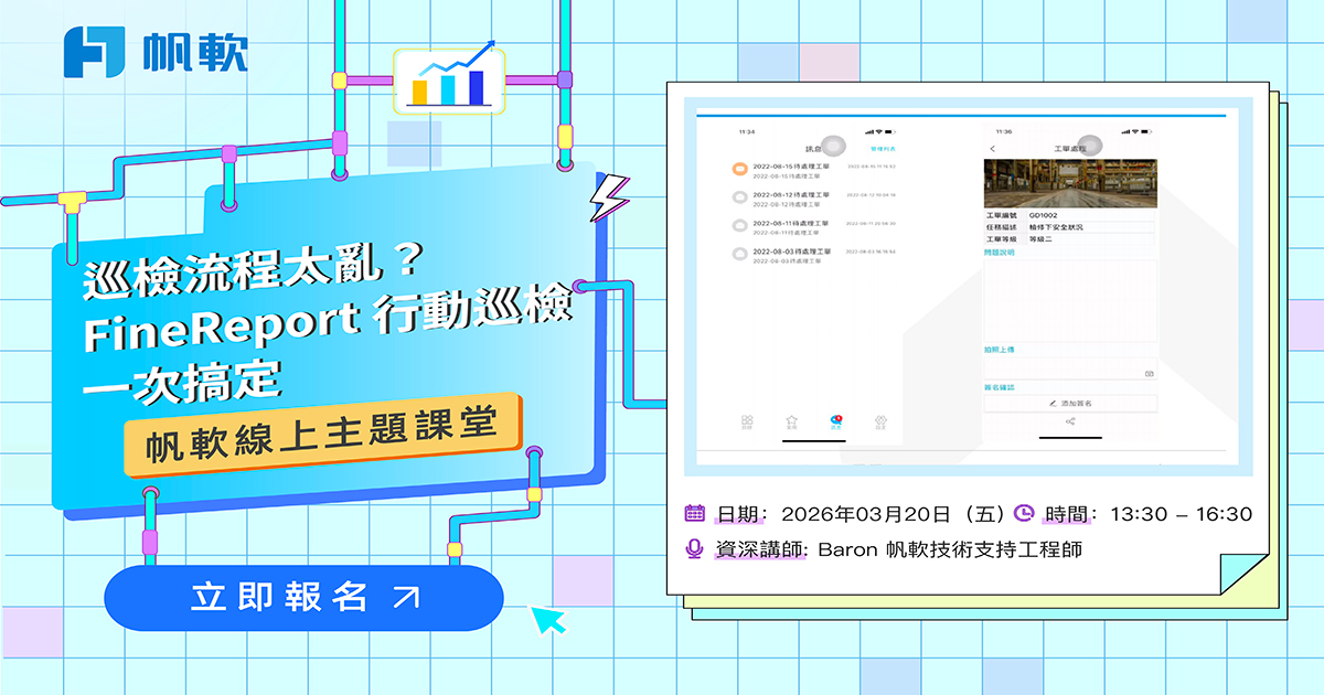 本課程聚焦「設備巡檢數位化管理」,解析傳統巡檢在工單分配、資訊回報與設備匹配上的效率與錯漏問題,並說明如何運用 FineReport 建立線上派工、行動填報與故障回報的完整閉環流程。透過流程設計與功能實作示範,協助企業實現巡檢即時化、標準化與高效率管理。